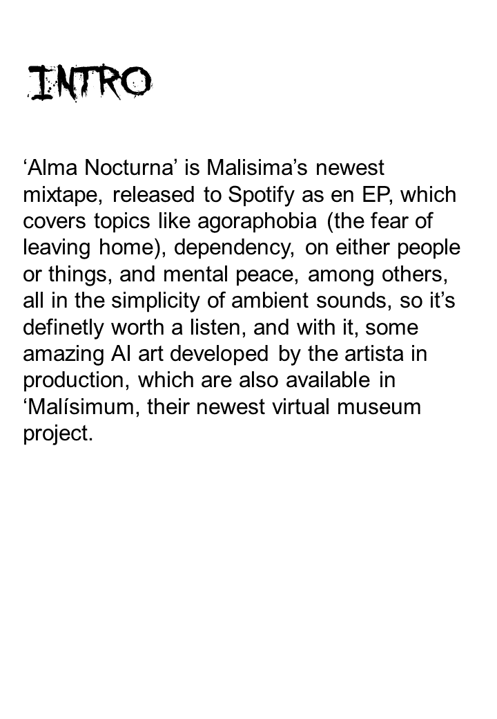 ‘Alma Nocturna’ is Malisima’s newest mixtape, released to Spotify as en EP, which covers topics like agoraphobia (the fear of leaving home), dependency, on either people or things, and mental peace, among others, all in the simplicity of ambient sounds, so it’s definetly worth a listen, and with it, some amazing AI art developed by the artista in production, which are also available in ‘Malísimum, their newest virtual museum project.